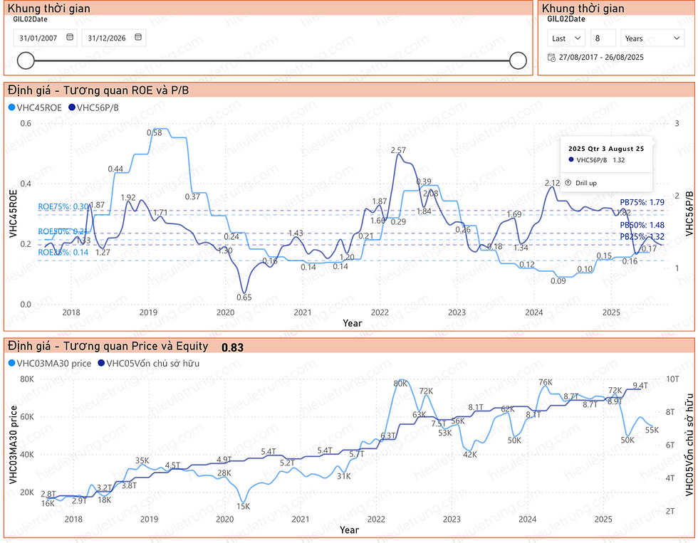 Lịch sử cho thấy P/B 25% thời gian trong lịch sử của VHC > 1.32 khi ROE > 14%. Hiện tại ROE đạt 17% và xác suất cao sẽ tăng lên 20% trong tương lai, tương ứng với P/B > 1.5.
